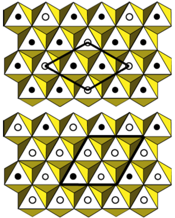 Cation ordering in octahedral layers of LDH for M(II)/M(III) = 2:1 (top) and 3:1 (bottom)