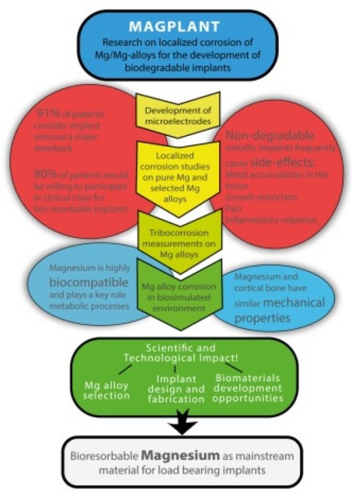 The project will develop in various stages contemplating multidisciplinary research topics. The first stage will embrace the development of microsensors that can be effectively used for local measurements on the near-surface of Mg-alloys, such as pH and H2 sensors. Localized corrosion techniques such as SVET and SIET will used during the following stages, where selected Mg-alloys will be studied in bio-simulated media of increasing complexity in order to build sustained and progressive knowledge. According to the essence and core objectives of Marie Curie Actions, these findings will be disseminated in multiple information channels in order to engage with different societal sectors and collect increasing attention from policy makers and relevant technological partners.