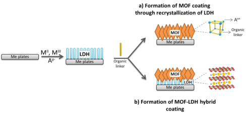 Additionally, in this context, metal organic frameworks (MOFs) emerge as potential nanocontainer coatings considering their unique properties, including high surface areas, large porosity, tuneable pore sizes and multiple functionalities. Strong affinity interactions have been recently identified between MOFs and LDHs. These interactions open new avenues for the preparation of protective coatings combining features of both LDHs and MOFs.