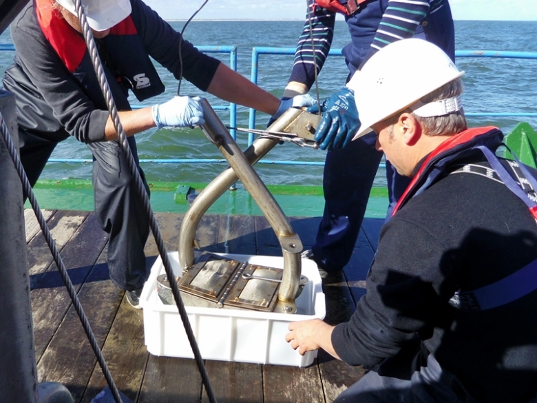 Kastengreifer zur Sedimentprobennahme im vorgelagerten Seegebiet der Elbe (Probe 18), genommen vom Forschungsschiff "Ludwig Prandtl" am 15.06.14 (Foto: Ulrike Kleeberg)