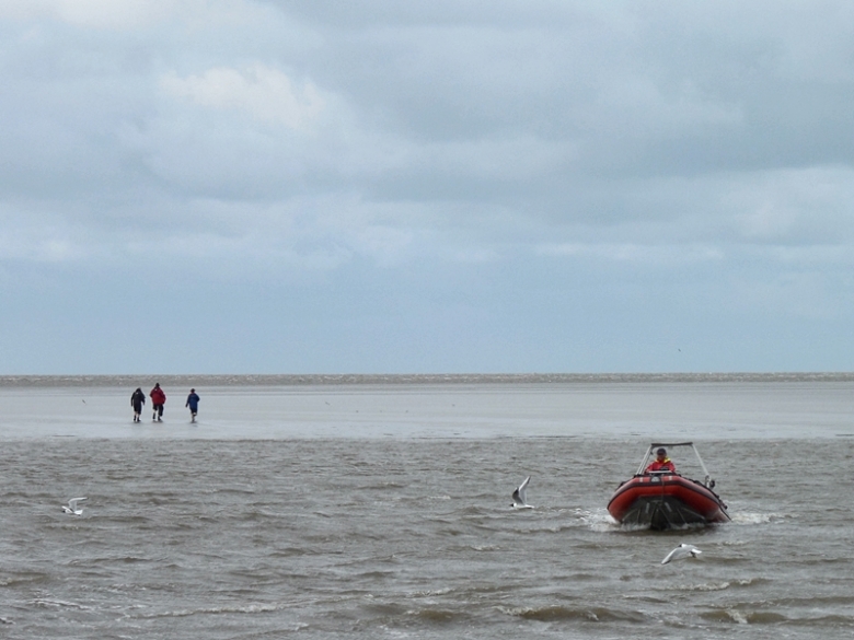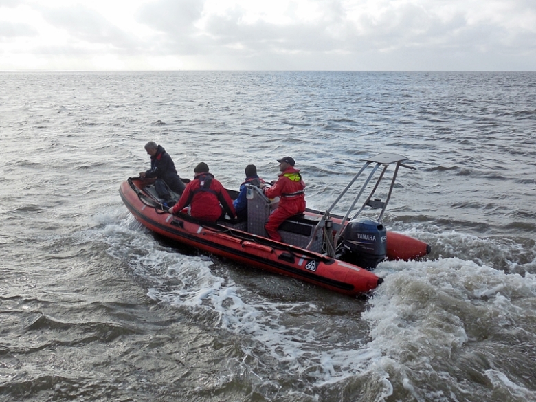 Sedimentprobennahme im Rückseitenwatt bei Langeneß (Probe 3) am 18.06.14, zu erreichen am besten per Schlauchboot (Foto: Ulrike Kleeberg)