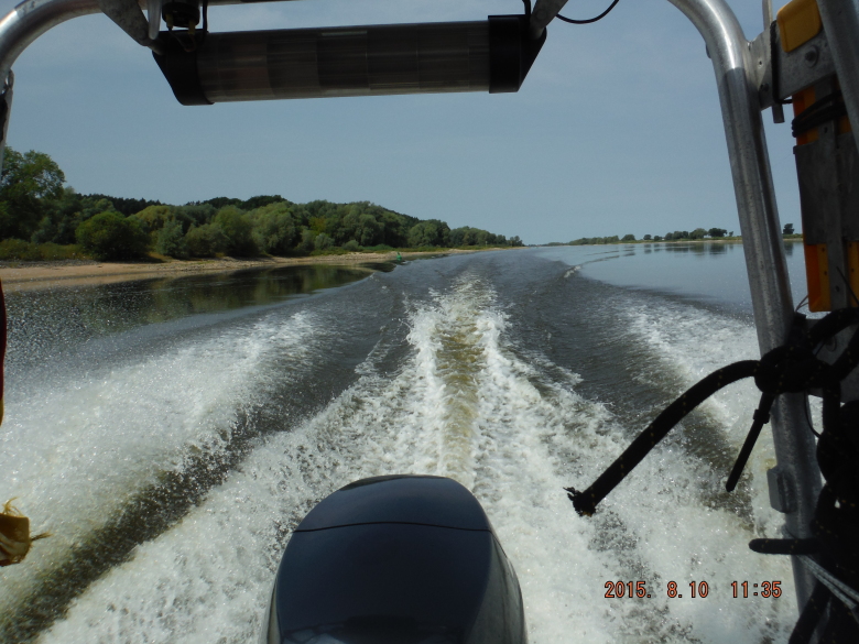 Nach dem Wehr in Geesthacht reichte der Wasserstand in der Elbe nicht mehr aus, um diese mit der "Ludwig Prandtl" befahren zu können. Wir stiegen in ein Schlauchboot um. Die Probennahme erfolgte vom Boot aus und ein Begleitfahrzeug sorgte für die Abnahme der Proben und den Nachschub. Die Proben wurden täglich zur schnellen Bearbeitung nach Geesthacht ins Labor transportiert.