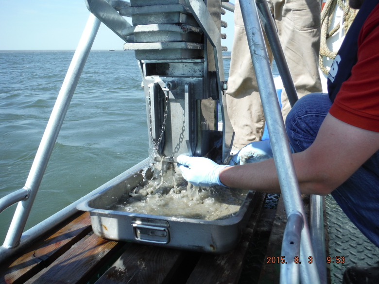 Sedimentprobenahme mit einem kleinen Greifer (Foto: Christiane Ruhnau/Hereon)